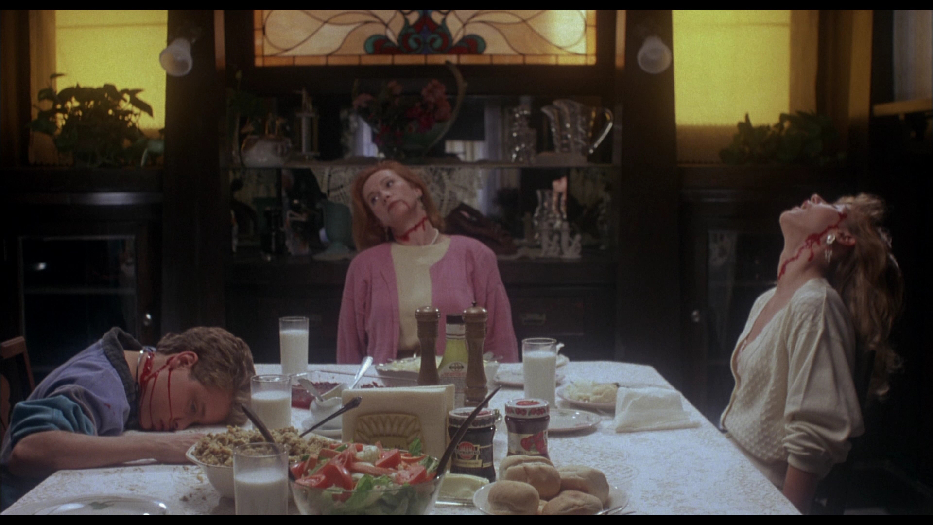 For the Grue-Guzzlers: Regrettably, the censors had themselves something of a field day at the expense of The Horror Show. While the MPAA ordered numerous scenes to be trimmed, what’s left is plenty gory, and dab handed SFX gurus Greg Nicotero and Howard Berger splash the grue about with gleeful abandon throughout. Decapitation, dismemberment, bare-skinned cleaver entry, bubbling flesh blisters, you name it… they promptly serve it up. And I shall never ogle a roast chicken with the same lusting allure after spending thanksgiving with the McCarthys.