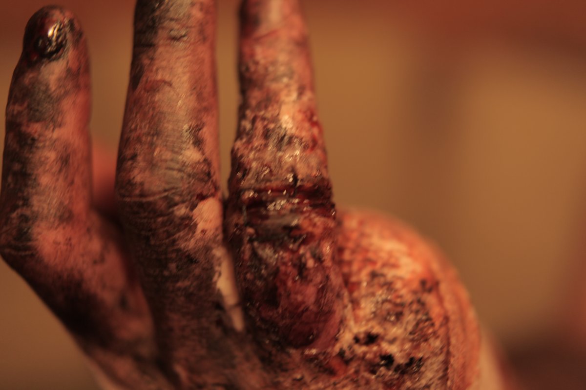 By the time her appendages begin to simply drop off, she’s almost nonchalant to it and the loss of a fingernail here and a digit there aptly showcases her growing psychological disconnect. This is taken to extremes in the final act when she loses all grip on reality and spreads the dirty love with both her partner and hopeful plaything. Indeed, you have to feel for the guys as she begins to look a lot less attractive once blackened and spoiling. It doesn’t stop suitor #2 taking an oral flossing from her but you can see he is having to fight hard to maintain his erection as her chapped lips slide up and down his member. Meanwhile, pus is spilling from a gaping maw on the back of her cranium. Poor douche looks like a rabbit in headlights.