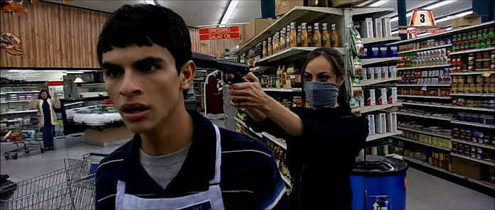 In truth, Alien Raiders is barely a horror flick at all. It plays out more like a siege movie and there are only occasional flashes of anything resembling horror. It centers on a mismatched group of shoppers and skivvies at a local supermarket in Arizona which is suddenly overrun with masked assailants. What initially appears to be a generic robbery soon transmogrifies into something much darker as their ‘spotter’ begins to deduce which of the hostages is malignant and which benign. The infection which manifests is left unclear for the first act as the numbers begin to get whittled down.